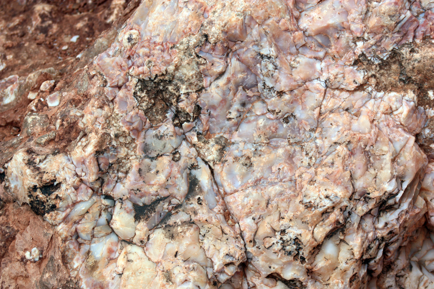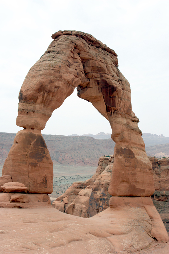 On Thursday, most of the group hiked in to Delicate Arch. The weather had turned colder and more threatening as the front slowly approached, but it was a nice hike to the arch (about 1.5 miles). Along the way, at the backside of the first hill, is an unusual rock formation of purplish chert. It was formed from the same red sandstone all around us, but here there was a fault line caused by the buckling of the underlying salt domes. As the two sides of the fault moved against each other, contact metamorphism converted the sandstone to chert, the red iron oxide turning purplish as it often does when metamorphosed.