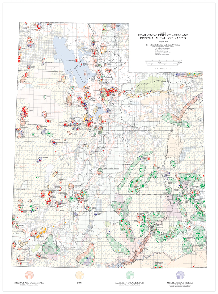 Steen’s success started a uranium boom in southeast Utah, and other deposits were soon discovered. They were mostly located in three major areas (as shown by this map of Utah’s mining districts – the green areas are uranium/vanadium mines). The first area centered around Moab and the Paradox Basin. A second major area was around the edges of the San Rafael Swell. The third was along White Wash, a remote area east of present-day Lake Powell. Uranium processing mills were built at Moab and Monticello, and the area prospered as money and jobs poured in.