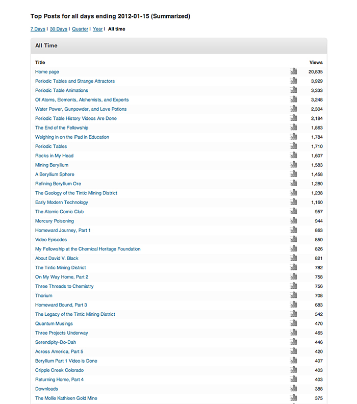 In April through June of 2013 we will switch gears and talk about nucleogenesis and the origin of the elements, then the physicists and chemists that have helped us understand the structure of the atom and quantum mechanics. From there, I will probably begin to talk about individual elements and how they are mined and refined, with examples of the mining districts where they come from, such as the history of the Viburnum Trend in Missouri and the lead mines there, or the gold mines of Cripple Creek, Colorado. I really do have enough materials now to keep this blog going for at least two years. And I’ll be gathering more all the time. I will also dedicate occasional posts to my efforts as a chemistry teacher and to science education in general, including my experiences at conferences, etc.