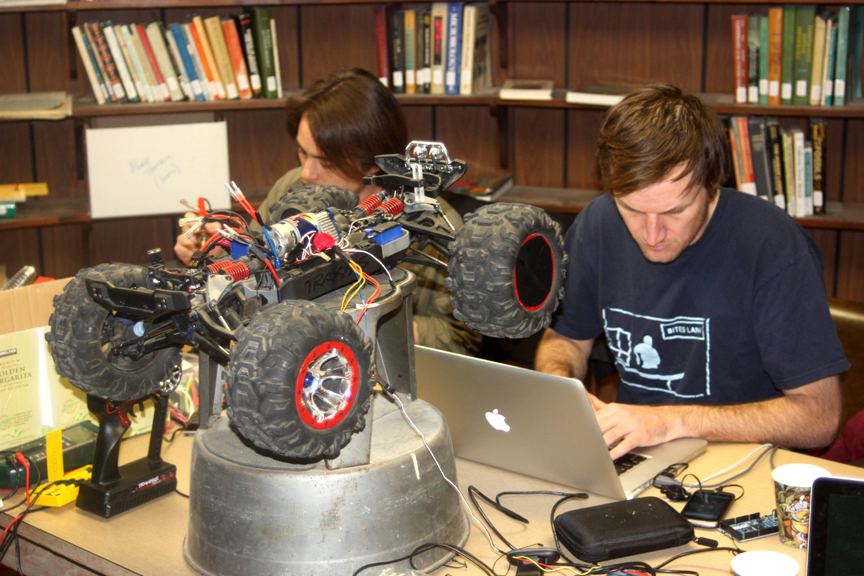 I also talked with Geoff Chu, Paul Mans, and Ryan Piaget from NASA Ames who are developing a prototype rover built from a commercial off-the-shelf RC car, with video camera provided by an Android phone controlled from a laptop over a local network. Motor servos are controlled by an Arduino brick. The point of this rover is to analyze the soil crusts remotely without having 20-odd people stomping around on them. The rover will be equipped with a stereoscopic IR camera that can read 3D depth, along with an RGB camera. My goal is to take the height data from the IR camera and convert it into a grayscale heightmap of the various crust locations, then turn the heightmap into a 3D model in Daz3D Bryce. The RGB photo will be mapped over the top of the model as a texture. Ultimately, the model can be uploaded to an online app where people can rotate and explore the crusts themselves.