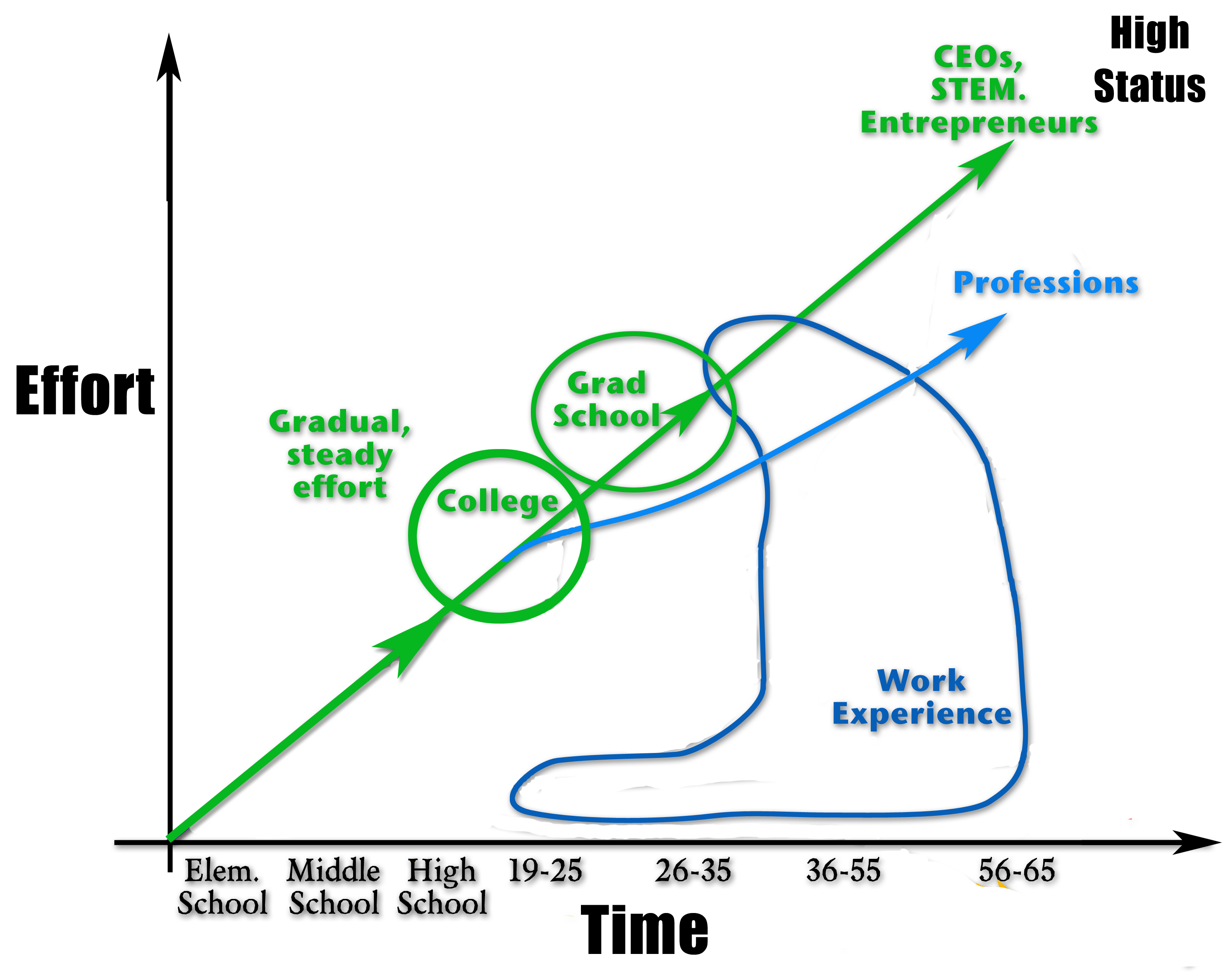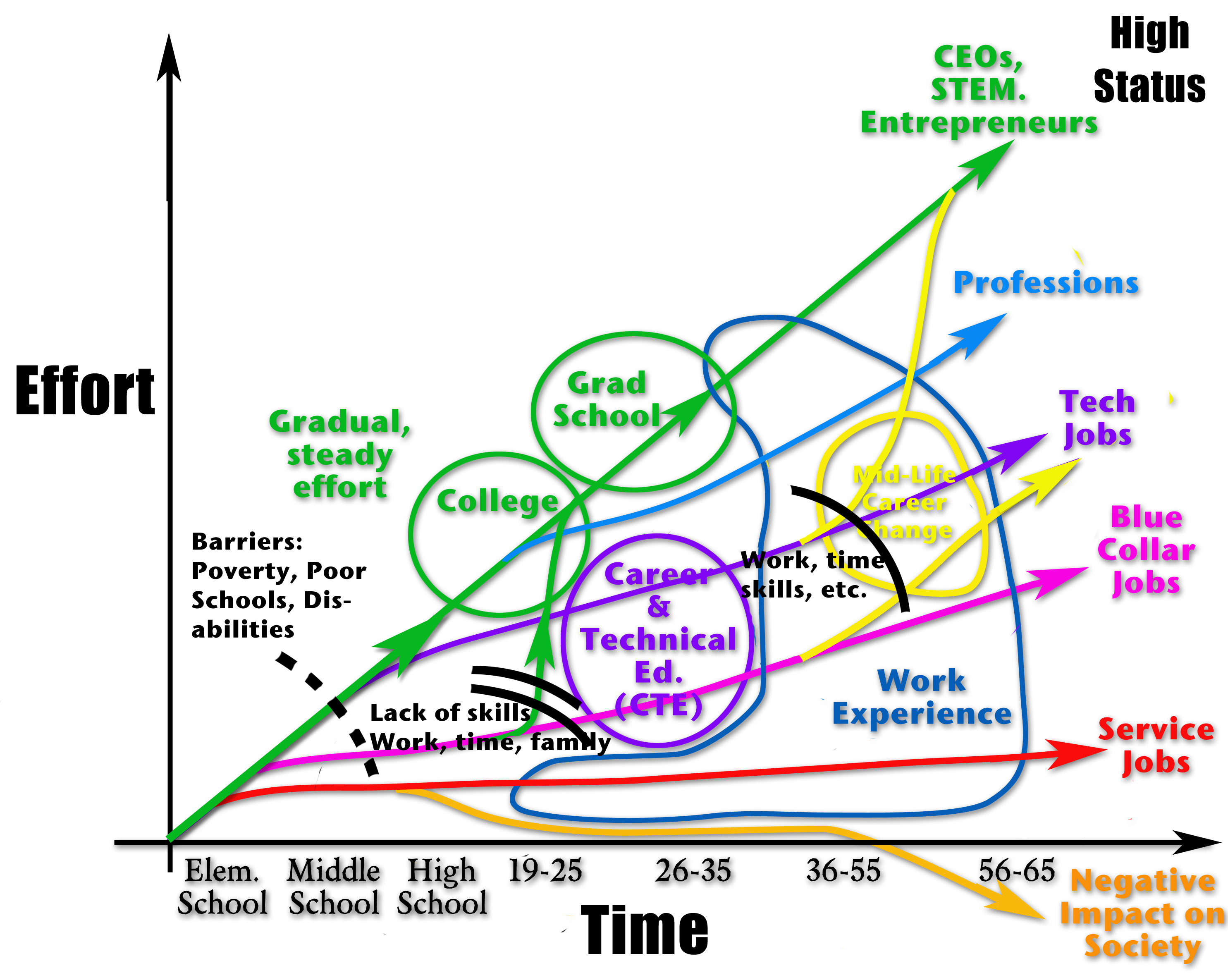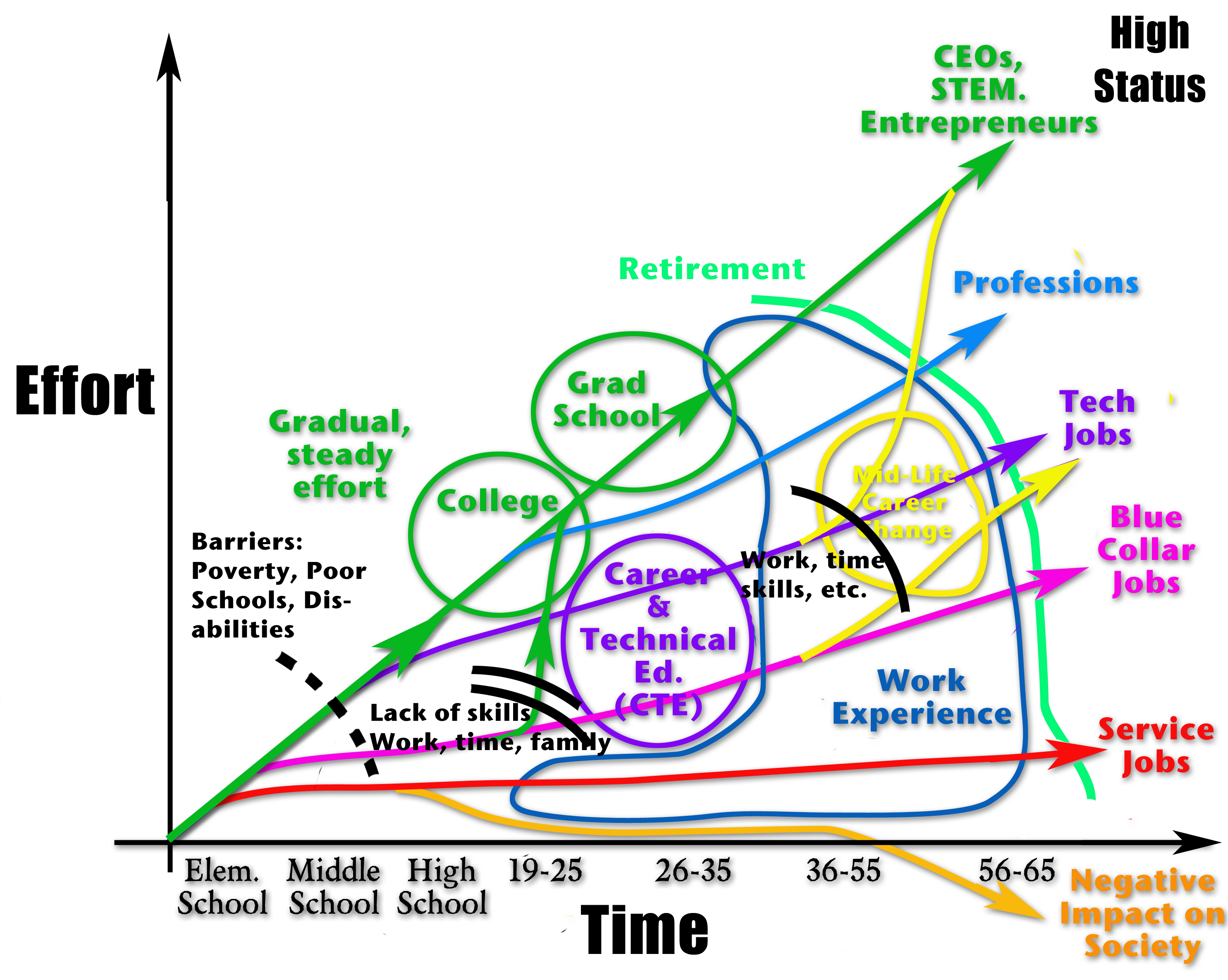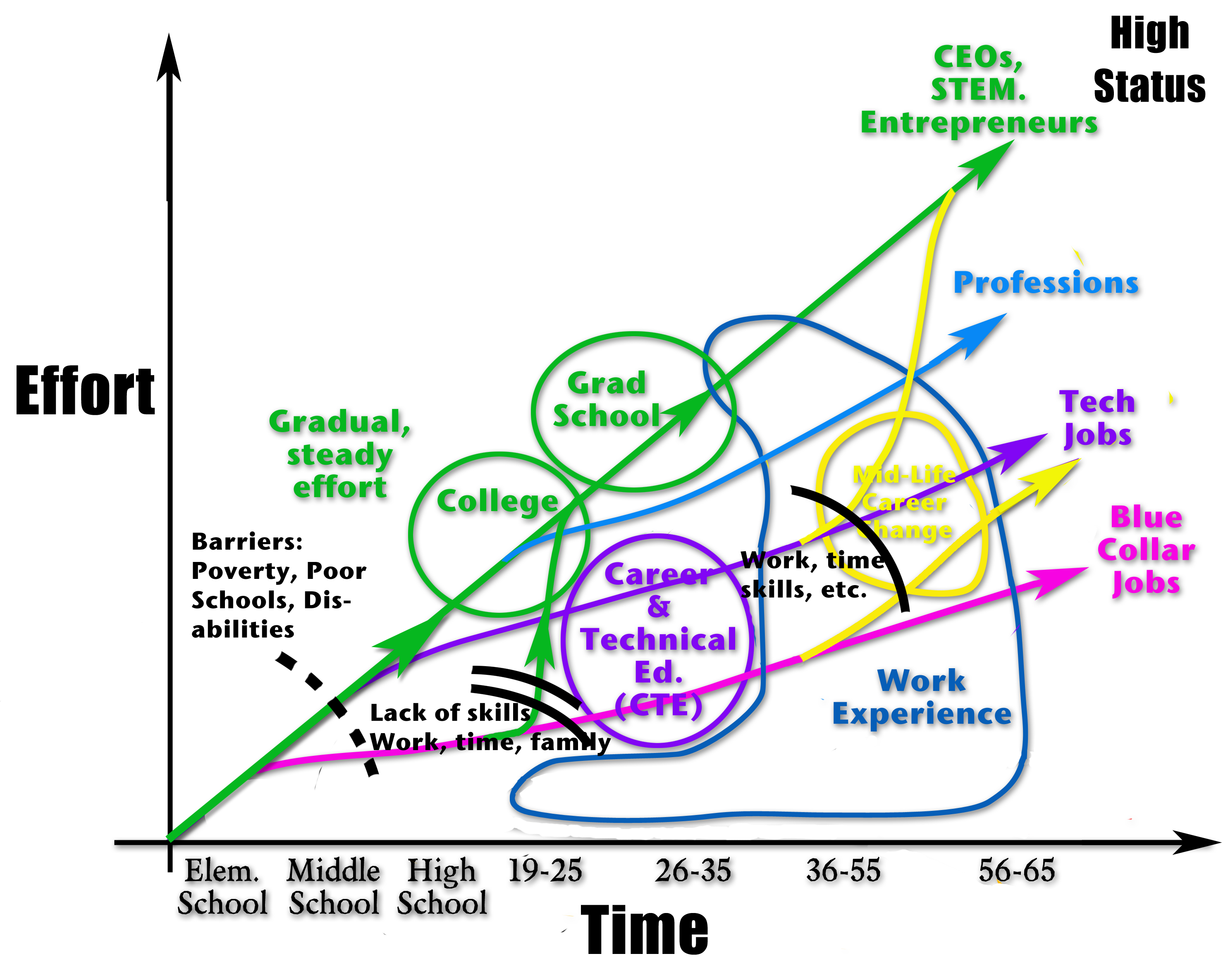 The vertical axis is effort, or the amount of work needed to reach a particular career outcome. The slope of our pathways represents work or effort over time (the physics teacher in me has to call them Power Curves). The steeper the slope, the more power is needed and the harder the pathway is to achieve. The vertical axis for career outcomes also corresponds with the level of personal choice available, the social status of the career, and usually the pay levels achieved.