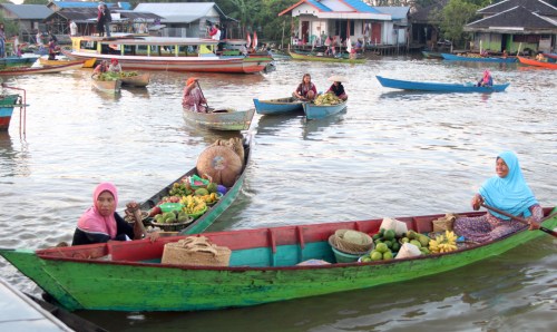 Approaching the floating market at Lok Baintan. Ladies in traditional clothing paddling long boats converged on our water taxi to sell fruit, vegetables, and souvenirs.