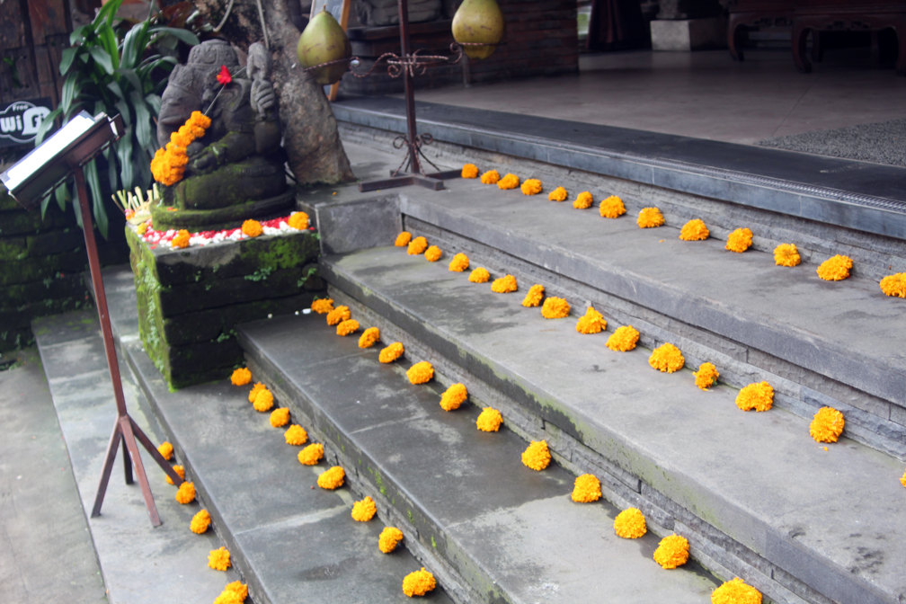 Marigold blossoms placed on the stairs leading to a hotel to drive away evil spirits.