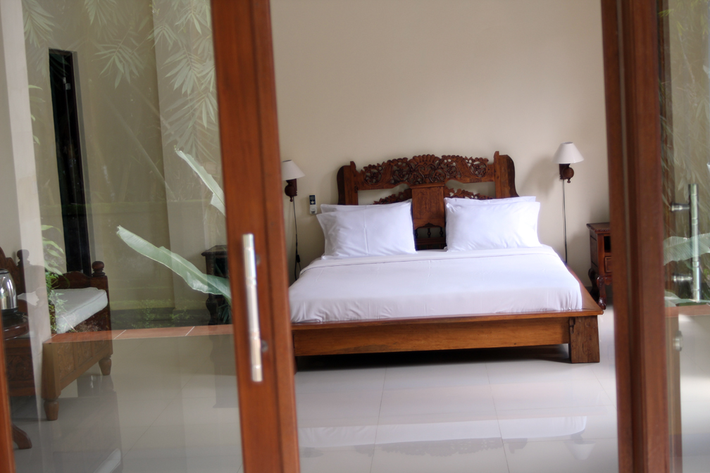 My room at the Ubud Wins Bungalow in Ubud, Bali. It had a large bed and open floor. I could draw the curtains for privacy.