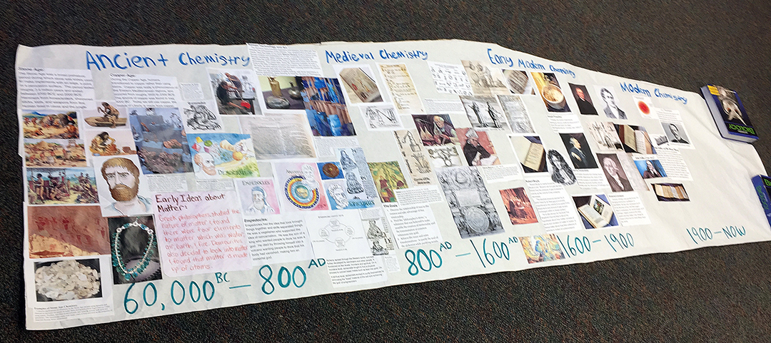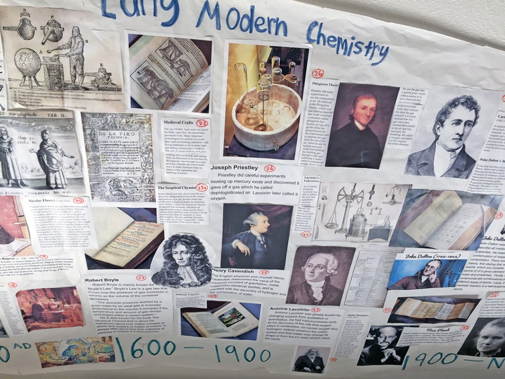 Part of a full-class banner on the history of chemistry, with each student assigned to do one image and caption.