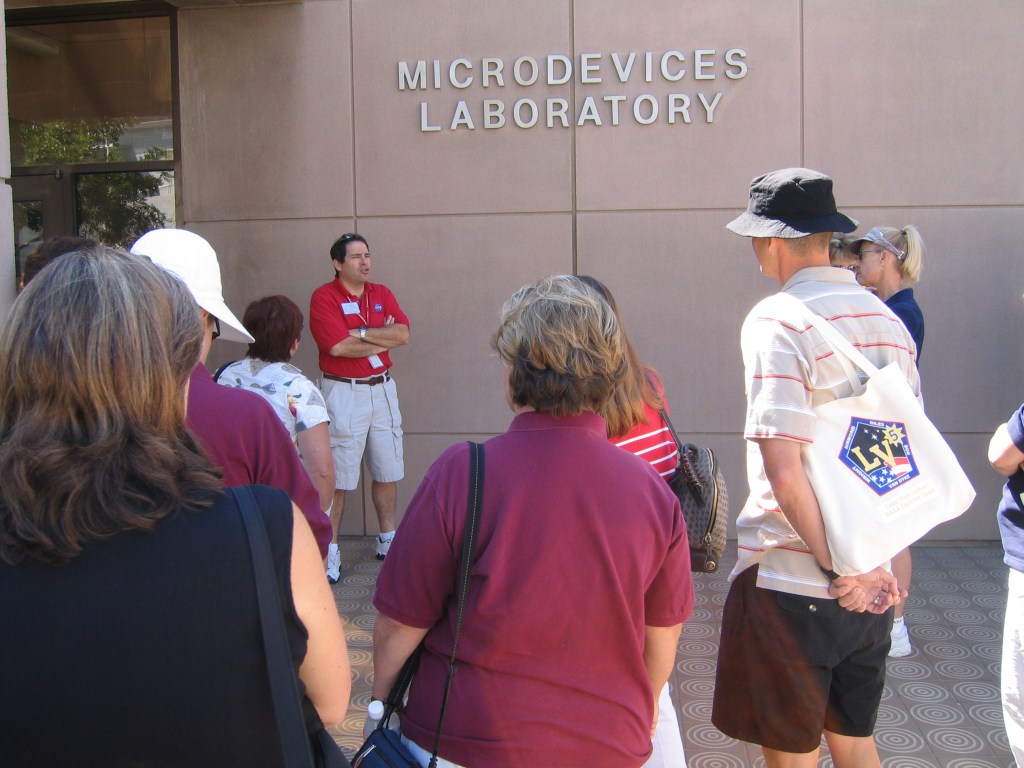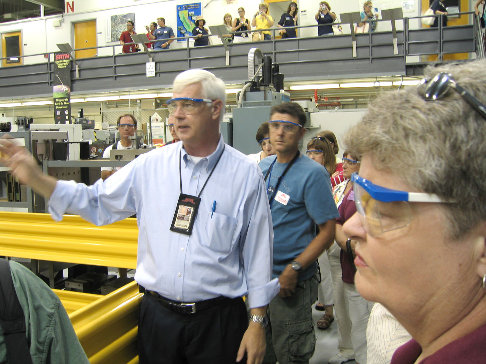 David Seidel, Education and Public Outreach Director at JPL, leading a tour of the Microdevices Lab with a group from the NASA Explorer Schools program in 2004.