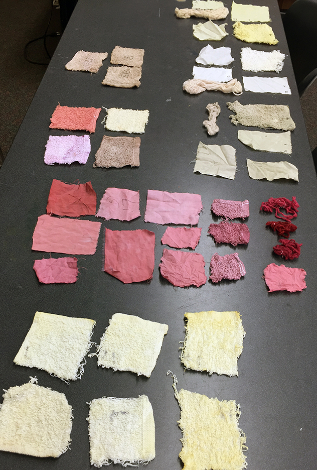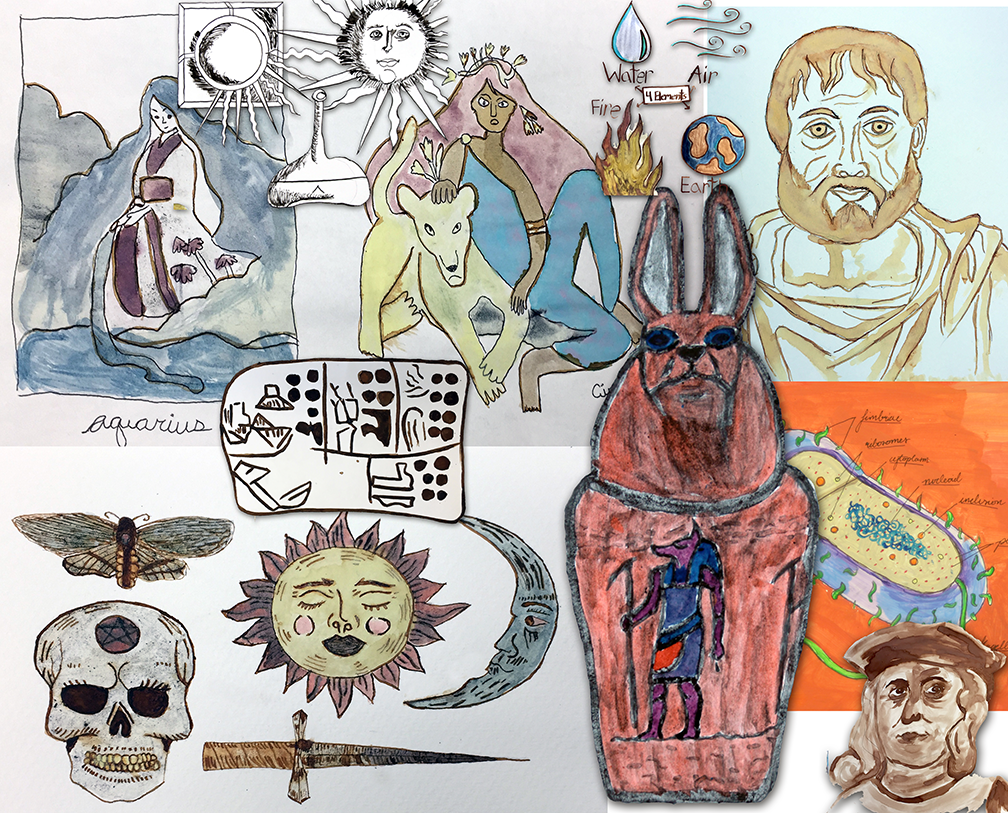 A collage of student-created illustrations using homemade ink and pigments, such as cochineal for the reds, Prussian blue for the blues, and iron-gall ink for the sepias.