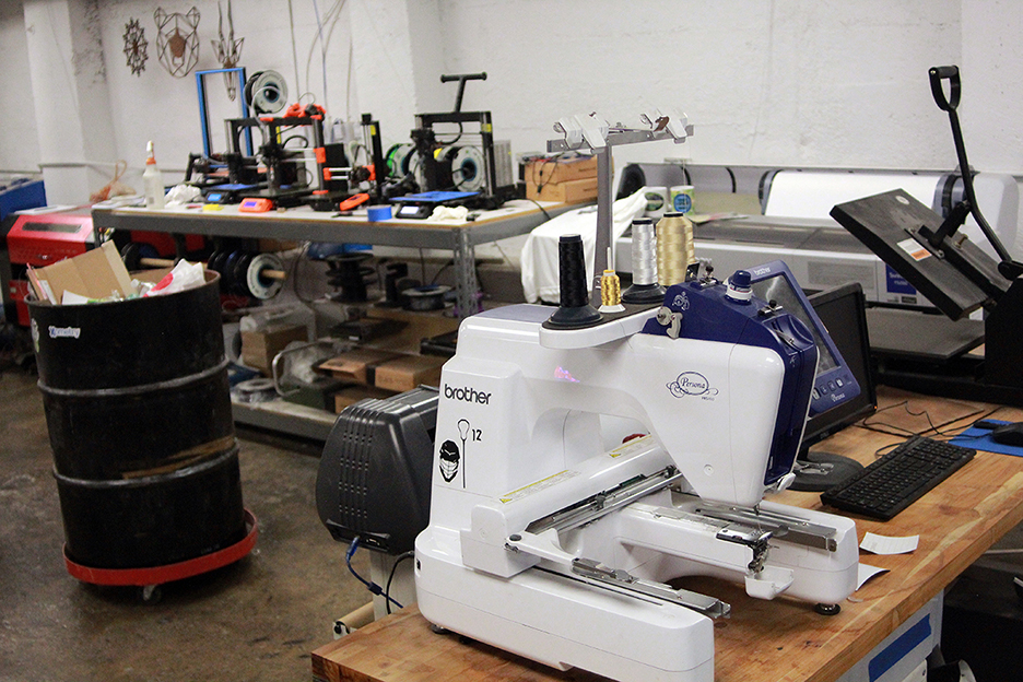 They have a variety of machines and tools at a higher level than a community makerspace, including an embroidery machine, a dye-sublimation large-format printer, four well-used 3D additive printers including two Prusas, two laser engravers, a CNC router, a milling machine, three resin-based 3D printers, and a variety of electric tools such as table saws, band saws, drill presses, etc. The wood tools were in a separate area with a vacuum system to control sawdust and doors to drown out some of the noise.