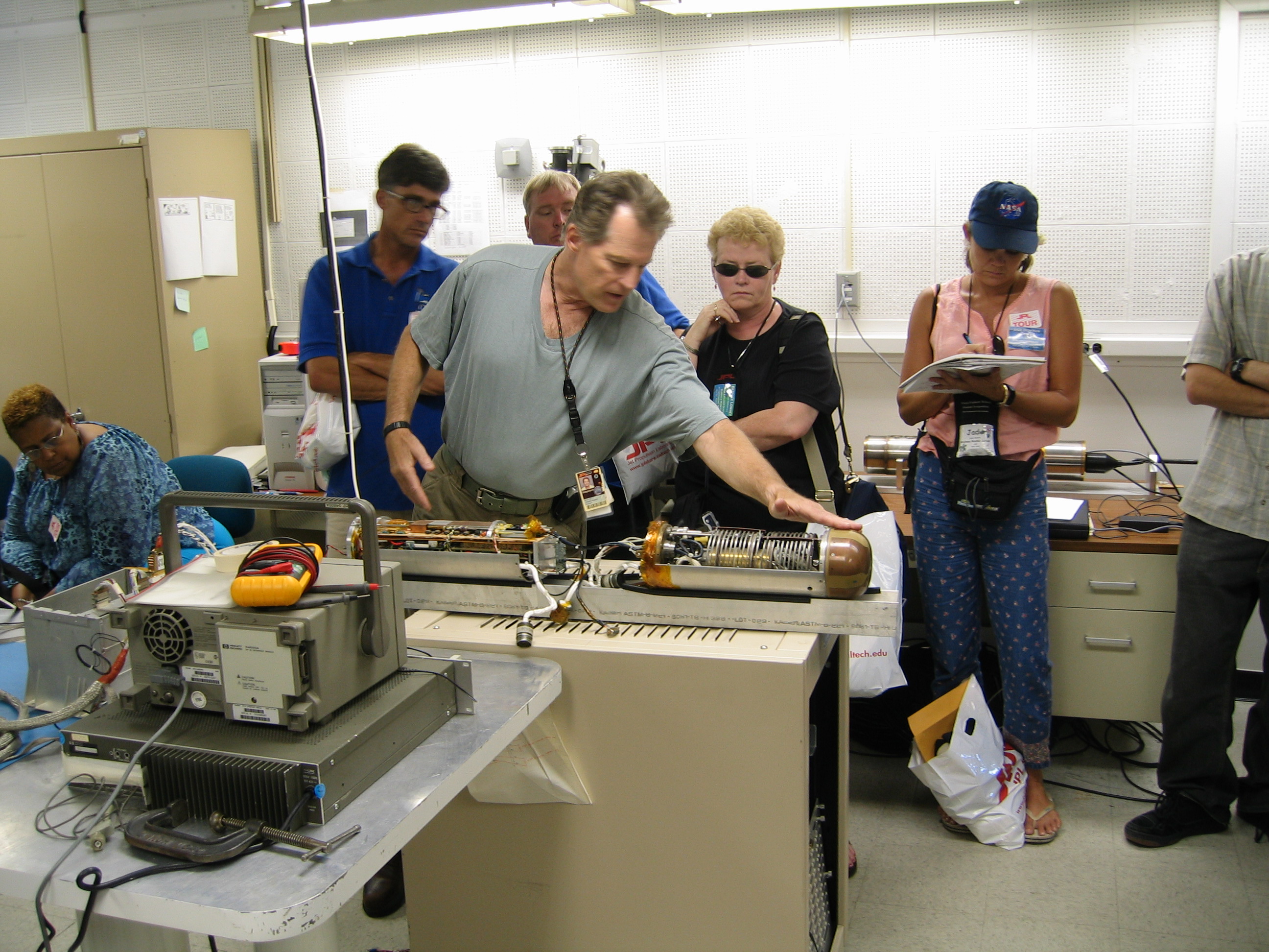 Wayne Zimmerman shows a group of teachers the cryobot that is designed to melt its way through layers of ice on Mars or Europa and has been tested successfully on an island off the Norwegian coast. Photo taken summer, 2004.