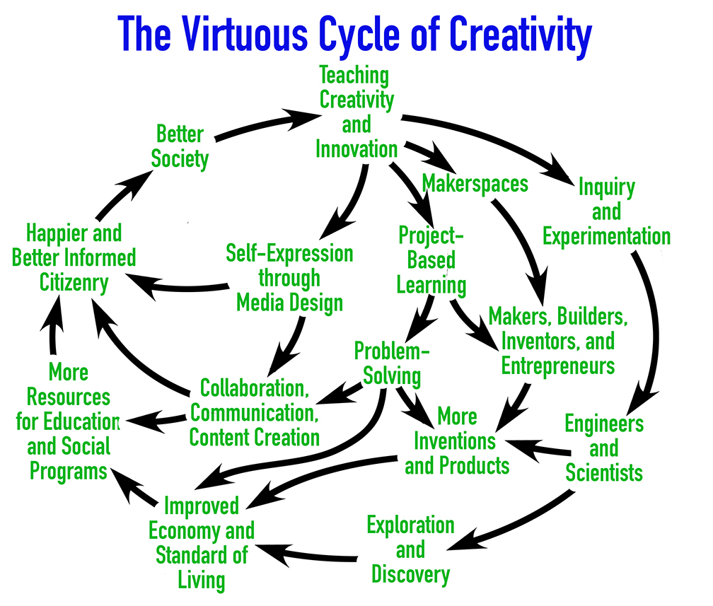 My own model of a creative classroom moves students from a state of ignorance about a subject through passive to active to creative levels of engagement. I need to determine if an innovative level may be warranted, and to see in what ways students can become innovators. Some avenues could include students becoming inventors, students as programmers or coders including developing their own computer games, students as makers (I am beginning to study makerspaces as part of my EDF 701-200 class this summer), students as teachers, students as education content creators, students as engineers, and students as scientists. Although there have been some studies in each of these areas, I don’t think anyone has put them together in quite the manner I propose nor looked at them together systematically. This could take years to fully explore.