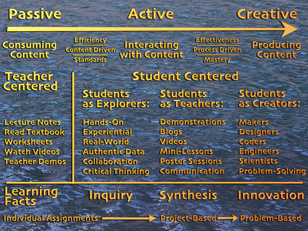 Before even applying to various graduate school programs, I sat down and identified six areas that I wanted to learn more about and where I could contribute my own experiences. I’ve mentioned them before, but here is a quick summary: 1. The nature of creativity and innovation: their importance to society and students, and how to teach them. 2. Project and problem-based learning: Gold standard PBL, how to implement it in a classroom and across entire schools, how to engage students in the process, and how to achieve quality results. 3. Using authentic data in science classrooms: What are the tools, theory, and pedagogy for using big data and conducting field studies? 4. Global awareness: why this is important and how to teach it through global problem-solving projects and best practices for collaborating with other students globally. 5. Students as teachers: Teaching media design skills to students so that they create educational content and become teachers. What is the theory, evidence, and pedagogy for this? This is one area of a greater concept of students as innovators.