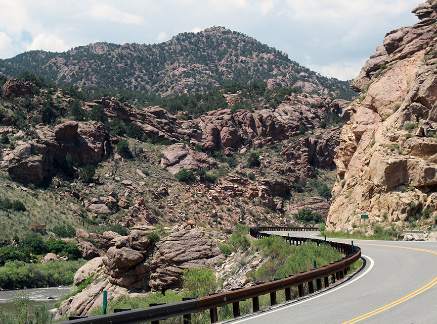 The highway traveling south along the Arkansas River in central Colorado. The pinkish along the road are metamorphic pink granite. I took this route when diverted off of I-70 because of mudslides in Glenwood Canyon during July 2021.