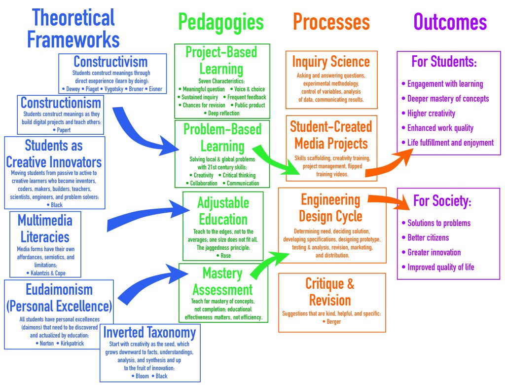 This schematic diagram shows the direction of my planned dissertation research. I will be mixing six different theoretical frameworks (not an easy task, but they all relate to my overall model of students as creative innovators) to support pedagogies of project and problem-based learning with mastery assessment for an adjustable education. The classroom processes include scientific inquiry, student-created media projects, the engineering design cycle, and student critique and revision to create the outcomes of highly engaged learning, deeper concept mastery, higher student creativity and quality work, and increased societal innovation.