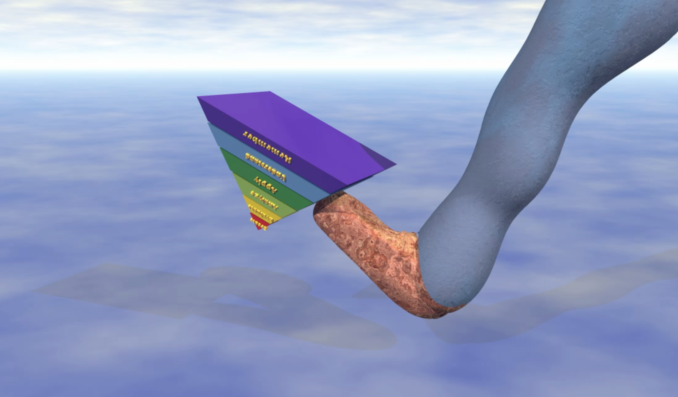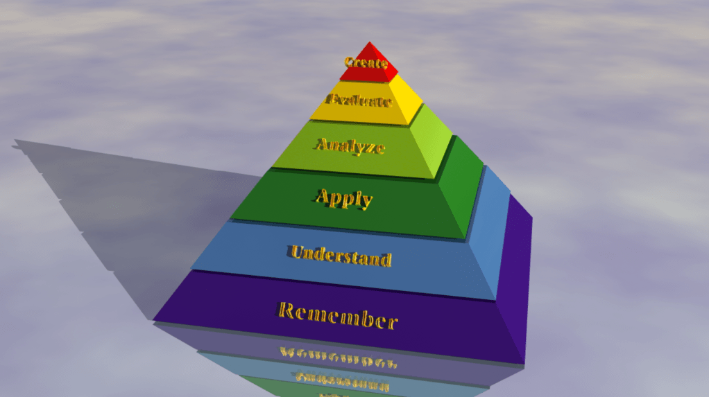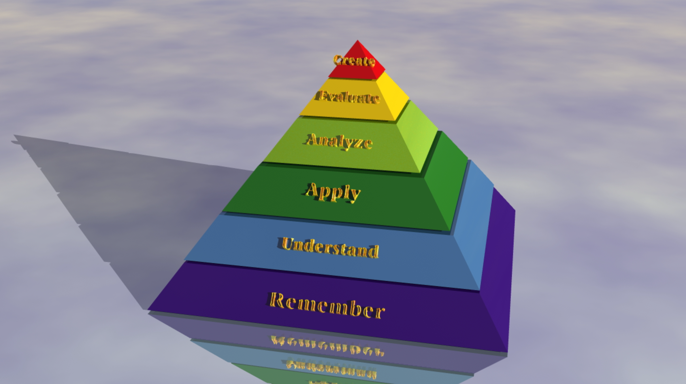 A 3D version of Benjamin Blooms taxonomy of thinking skills, starting with remembering facts at the bottom and building up through understanding, applying, analyzing, evaluating, and finally reaching creating. Most teachers spend so much time on the basic facts that they never get to the creating level, which is the most motivational and engaging level of the hierarchy.