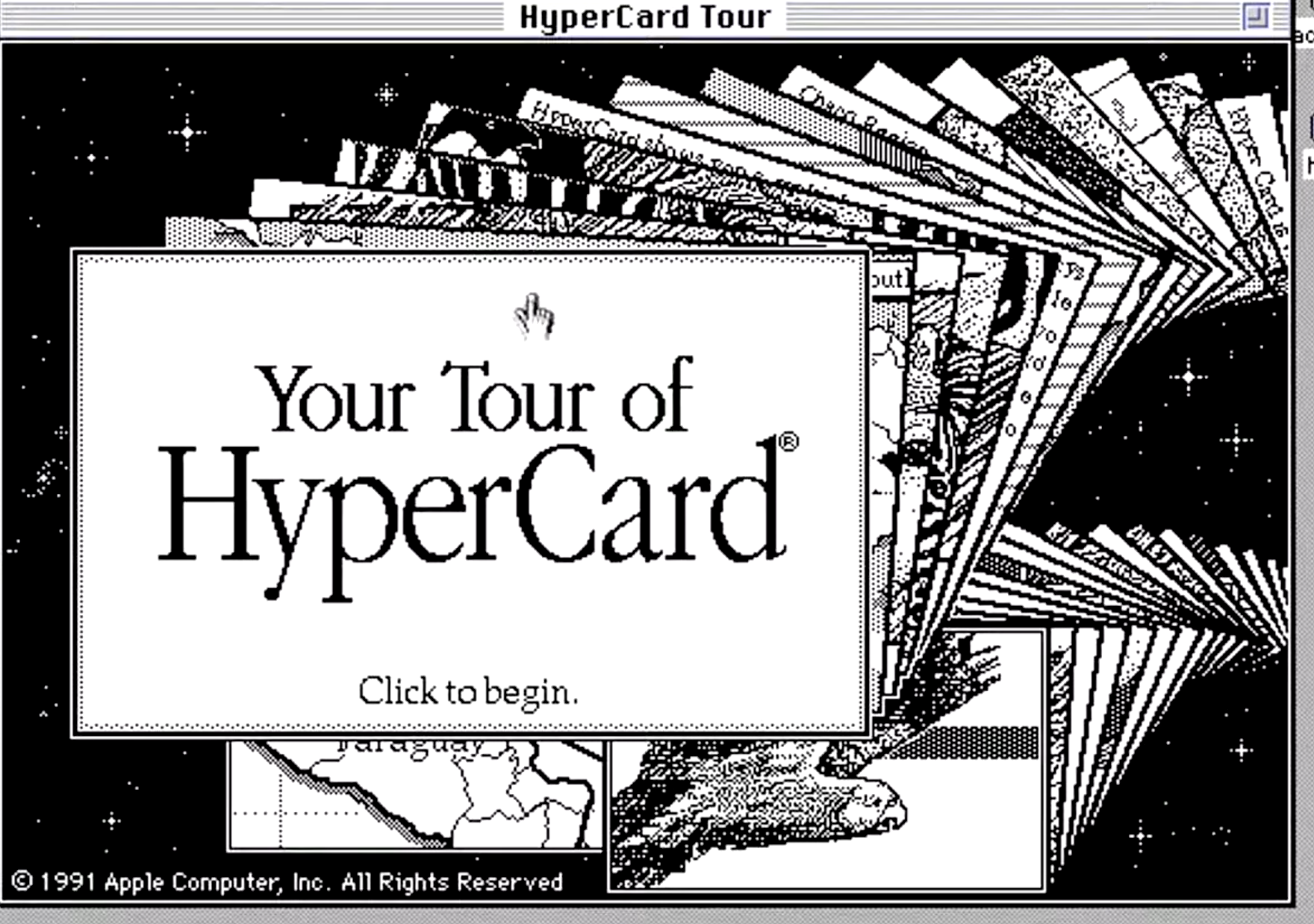 A screenshot of the HyperCard learning tour, made with HyperCard. This looks primitive compared with the sophisticated software we have now, but it was the first program to allow interactive programming with a Graphical User Interface. My students used this to create their organic molecule project.
