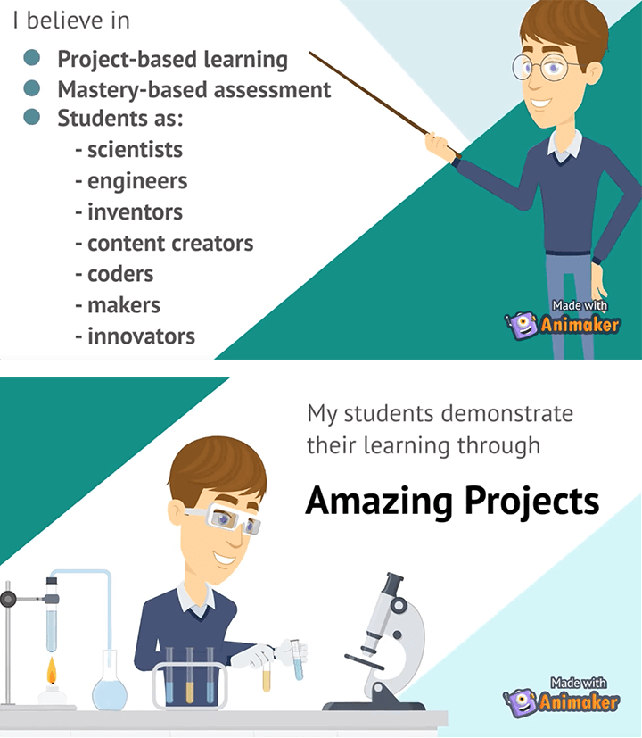Two frames from an Animaker resume, one of the types of projects described on my website. Instead of the usual static Powerpoint or Google slideshow, why not allow your students to do something with a bit more pizzazz, such as an animated slideshow or Prezi?