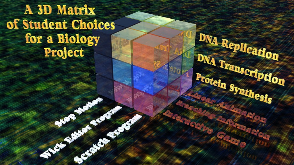In-Class Projects: This second semester my focus is on three major student projects which will provide data for my dissertation. The first is their next in-class only project, and I am using different levels of choice and structure for the three classes to provide comparison and research data. The biology students will be creating an animation on one of three topics: DNA replication, DNA transcription and translation, and protein synthesis. They have three choices for software usage: do a stop-motion animation with video software to compile the images; use MIT Scratch to program a linear animation or game; or use Wick Editor, which is a linear animation program similar to an older version of Adobe Flash. I am finishing up the second Scratch video today and will get it posted to YouTube and my website tomorrow. Their third dimension of choice is the type of project they choose to do – it can be a linear animation, a branching information program, or a game or quiz. Altogether, since you cannot do a branching program or game using stop-motion animation (which has to be linear), there are 21 possible choices for each group. The entire project has fairly high structure and limited choice, which is needed for this group of students.
