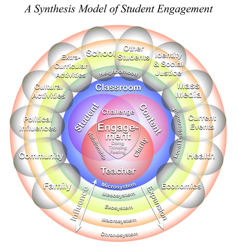 The synthesis model, shown here, places the classroom as a microcosm at the center of multiple spheres of influence, including the school, the community, the larger society, and across time. All of these spheres exert an inward influence on the classroom and affect how well students engage in classroom activities. For example, the exosystem of state requirements and standards determines what a teacher is supposed to focus on in a particular subject, thereby influencing what students are allowed to learn. Inside the classroom itself engagement is mediated by the three factors of the Fisher et al. model, which are the student, the teacher, and the content with engagement occurring at the intersection of all three. Groccia’s model was specifically for college students, represented by overlapping zones of influence such as other students, the community, the faculty, the research/subject, and so on. In high school, I found there are at least twelve factors that are usually seen as being outside of the classroom but which influence the classroom and a student’s ability to engage. These include family, friends, social media, jobs, after-school activities such as sports and clubs, identity and social justice needs, current events, politics, physical and mental health, other students, and so on. These are not just distractions for students; they can actively influence what happens and what is taught in a classroom.