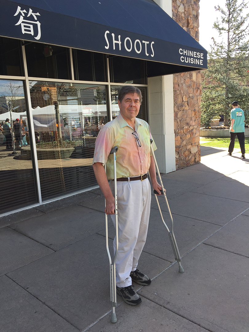 On crutches during March 2022. My knee is doing much better now after some extensive physical therapy.