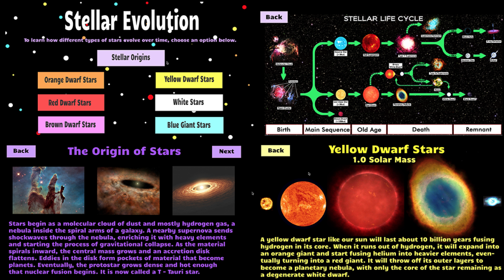 Frames from a project on stellar evolution created in Wick Editor, a linear animation/interactive software. Students can choose which type of software and which type of project (here a branching informational program) to demonstrate mastery of their chosen STEM concept.