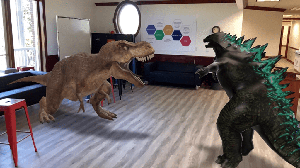 To test Adobe Aero for Augmented Reality, I placed T-Rex and Godzilla in the common room at Westview School. The five steps of the Stanford Innovation Lab projects are on the poster behind them: Empathize, Define, Ideate, Prototype, and Test. Students are moving into the Define stage now.
