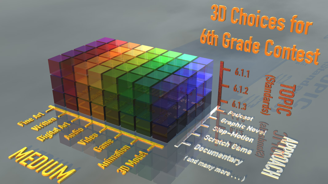 The second question implements the first through a science communication contest we are calling the Cosmic Creator Challenge, where students create their own digital media projects on the sixth-grade space science standards for Utah. You will notice in my first research question that I am using three-dimensional student choice as the experimental variable. I have not yet explained what 3D choice is on this website. Here goes: