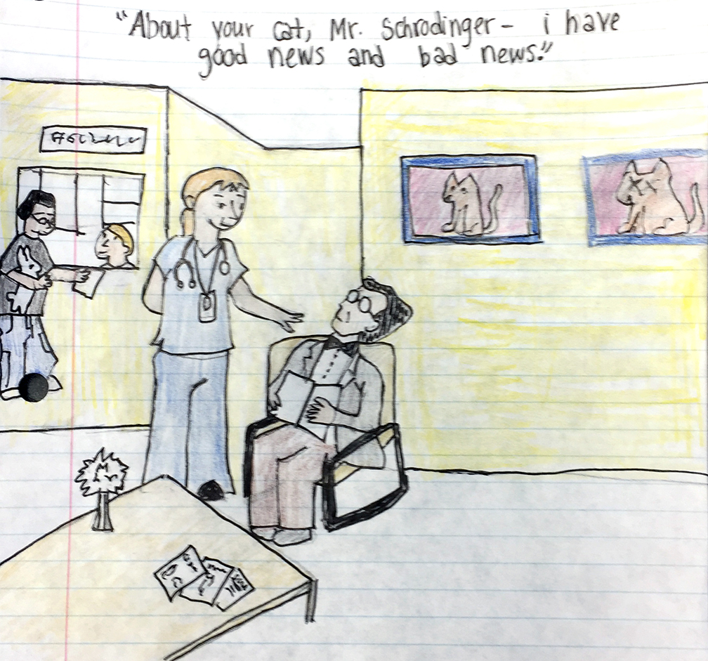 One of the cartoons from the quantum joke book. The character in the chair is a pretty good Schrodinger!