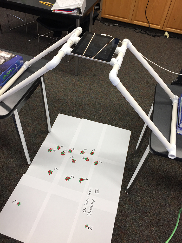 A stop-motion animation set-up for showing a chain reaction in a unit on nuclear chemistry. This frame shows three neutrons about to initiate the second order nucleus splitting.