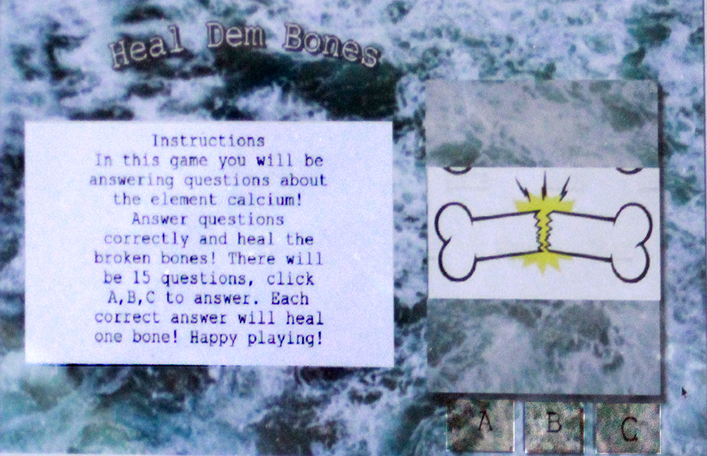 The main interface for the Heal Dem Bones game on calcium. The student designed the graphics and buttons and programmed the game, so that by answering questions about calcium, you heal a set of broken bones.