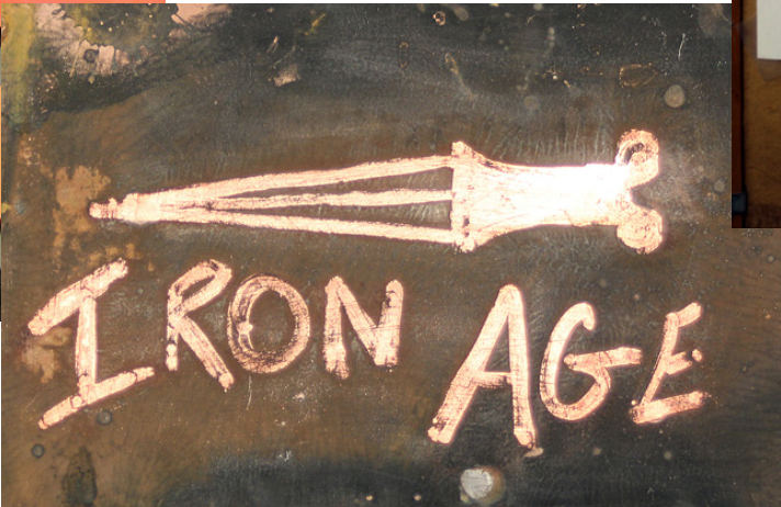 A copper etching done by painting fingernail polish on a copper sheet, then placing in a sealed container with salt and vinegar potato chips with a little extra salt and vinegar. Once corroded, the nail polish is removed with acetone. This was for a project on the iron age for the history of chemistry unit.