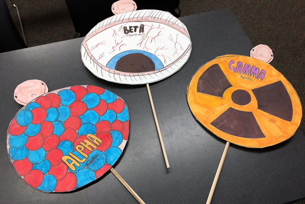Puppets showing different types of radiations used in a student skit for a unit on nuclear chemistry.