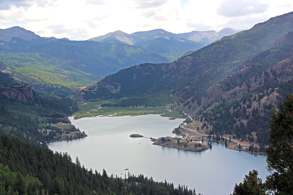 I came to Lake City from the south along Highway 149, driving from Creede along the headwaters of the Rio Grande River over the Continental Divide at Spring Creek Pass (10,901 feet). After staying on the high plateau, the road climbs again to Slumgullion Pass at 11,361 feet. It then descends toward Lake City, taking a series of dramatic switchbacks. At one hairpin turn, there is a nice overlook of Lake San Cristobal and Lake City. I stopped to look at the interpretive signs and take a few photos.