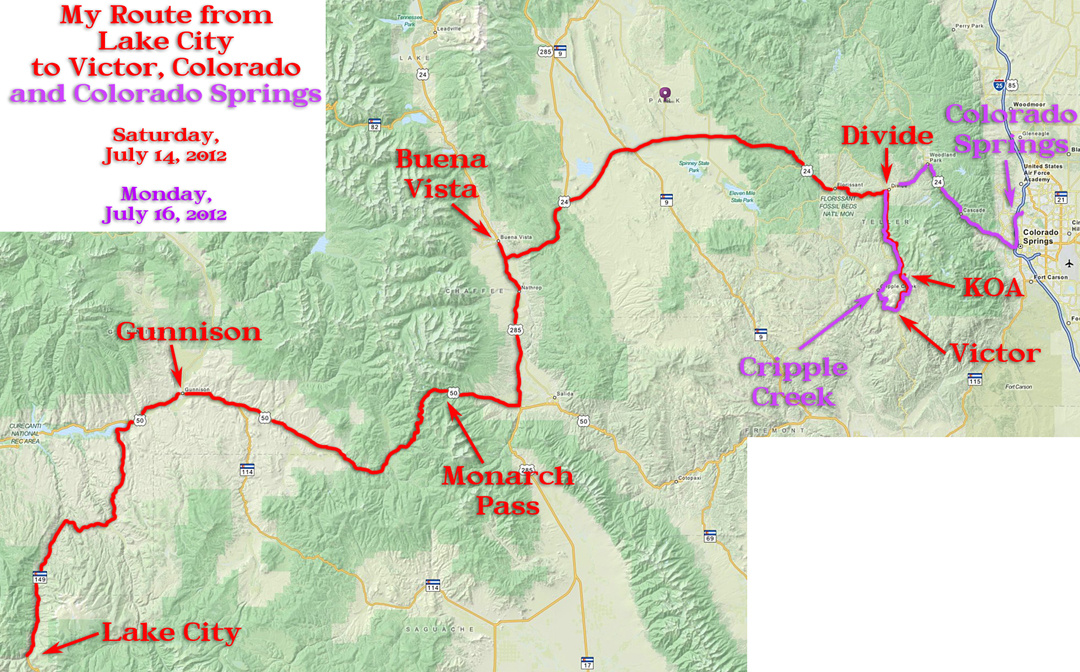 I was getting very tired by the time I got to Divide and turned south. I took the turn toward Victor, but somehow missed the KOA in the dark and wound up driving all the way into town. I turned around and headed back. I almost missed the sign again. The KOA is located just south of the turnoff to Victor, and I arrived about 11:00. The manager had left a map for me in the entranceway to the office with my site circled, a tent site on the outer edge of the camp. It took a couple of drives around the camp before I found the right trail leading off to the tent sites. Mine was Site 1, nestled back in the aspens with good privacy. I was too tired to make camp, so I just rearranged my gear, setting stuff outside like the tent that I knew bears wouldn’t get in to, and made a fairly good bed in the back of my minivan.