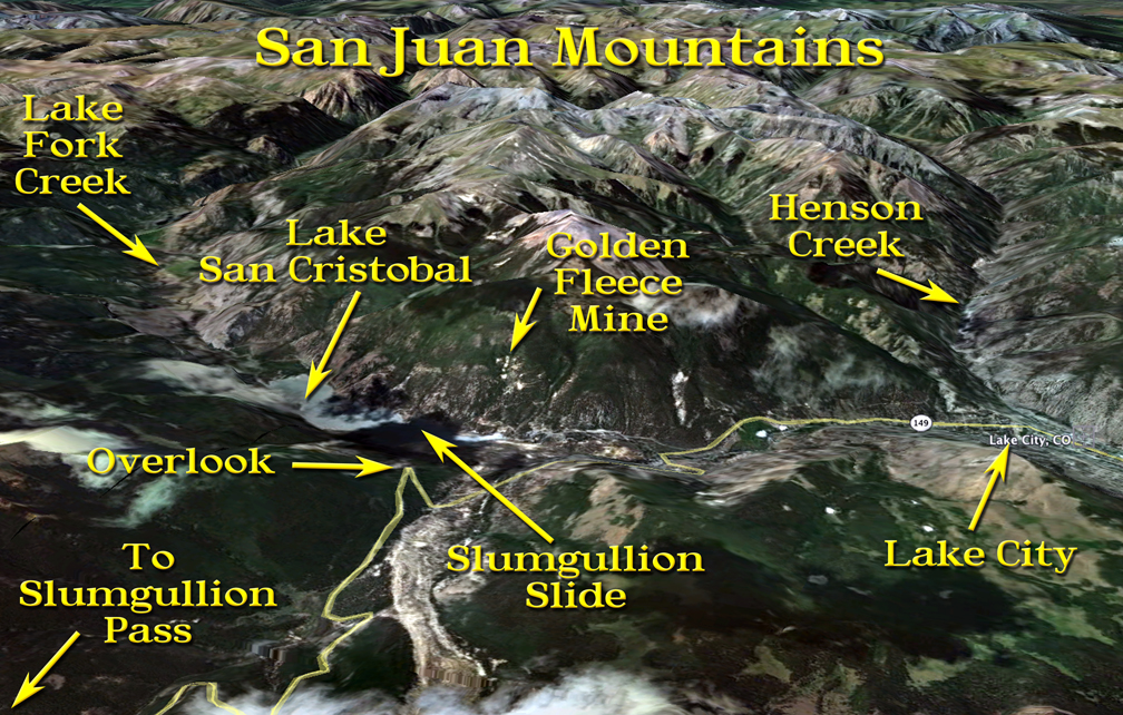 The same caldera eruptions that brought veins of silver, gold, lead, zinc, and copper to the San Juan Mountains also placed veins in this area, cut into by glaciers to form the rugged peaks and ridges of the San Juans. About 800 years ago, a large earthflow filled the canyon and damned off the Lake Fork of the Gunnison River, creating Lake San Cristobal, the second largest natural lake in Colorado. Lake City is located in a dell about three miles below this natural dam. The slide itself is called the Slumgullion Slide, because its brownish-orange color studded with boulders reminded the early miners of slumgullion stew, a beef stew with onions, carrots, and potatoes.