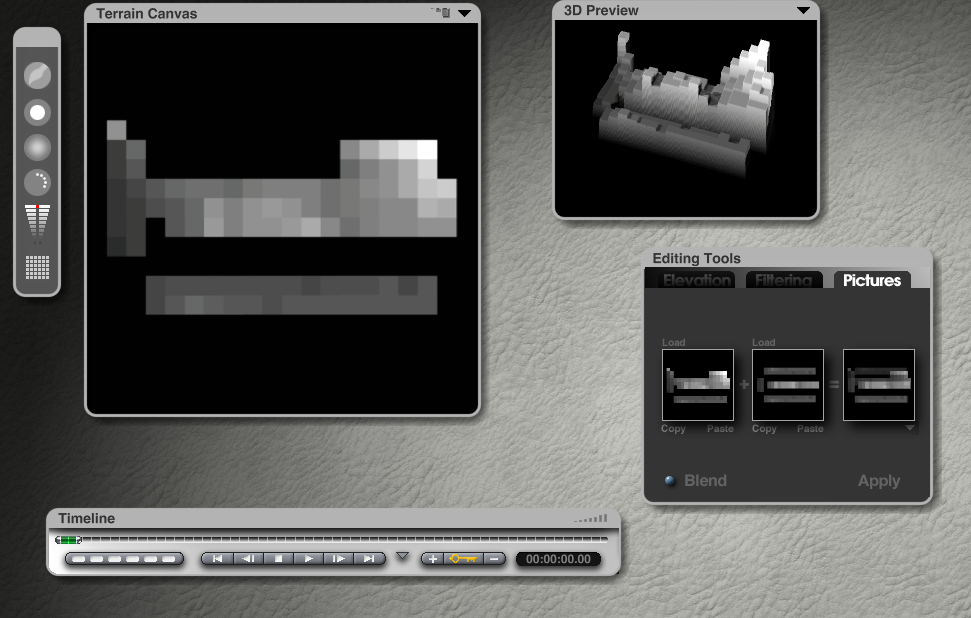 In Adobe Photoshop or GIMP, students load in the screen shot and cut it so only the grayscale area remains, then increase the resolution. You will need to blur it slightly (2-3 pixel Gaussian blur) to get rid of artifacts around the edges of the squares. Then make the canvas square by adding a black background using the “Image-Canvas Size” feature in Photoshop. You can do a similar function in GIMP. Save it as an RGB or 8-bit grayscale PSD or PNG file. This prevents the grayscale heightmap from getting distorted in the 3-D terrain editor.
