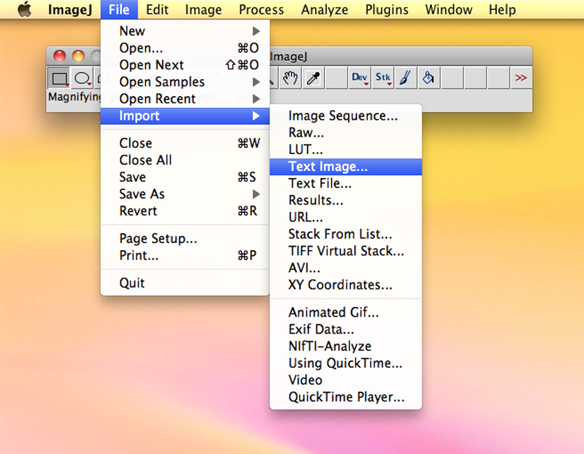 Once the comma-separated rows of numbers are done and checked, the students save the array as a raw text file (.txt) so that all formatting is erased. They then load the file up into a program called Image J. This program is freeware developed by the National Institute of Health and is very useful for analyzing images. To load in the number array .txt file, students need to go to the file menu and choose “File-Import-Text Image” and select their .txt file. This will create a grayscale image based on the .txt values: the lowest values (the zeros around the edges of the periodic table) are black and the highest value is made white. It will be a small image since the entire array is 20 by 12 pixels. You can save the image created or zoom in on it as close as it will with Command-+ and save a screen shot of it.