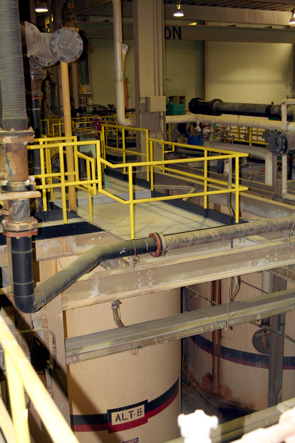 Lead flotation tanks at the Mayflower Mill. Reagents were added that would float the various metals, such as copper or lead, to the top of the liquid on soap bubbles which were skimmed off into the trough in front. The remaining metals were depressed to the bottom. Impellers would keep the solution agitated while blowing air through it.