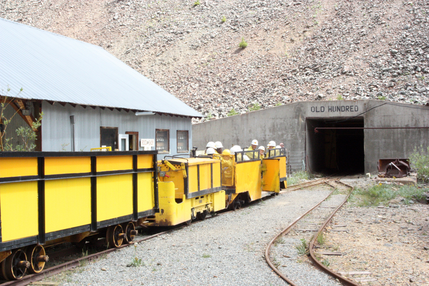 Once processed, the waste material is called tailings and was made up of water and sandy ground rock. It was pumped down to settling ponds, where the solid tailings would settle out. This was an innovation of the Mayflower Mill, as previously the tailings would simply be allowed to flow into the Animas River. The high sulfur and iron content in the tailings would travel down the river and created the reddish stains on the rocks that I noted on my train trip up the gorge several days ago. At the Mayflower Mill, the ponds were shifted so that the solid tailings would build up a series of mounds downhill from the mill. These have now been collected into a large tailings pile near the mill.