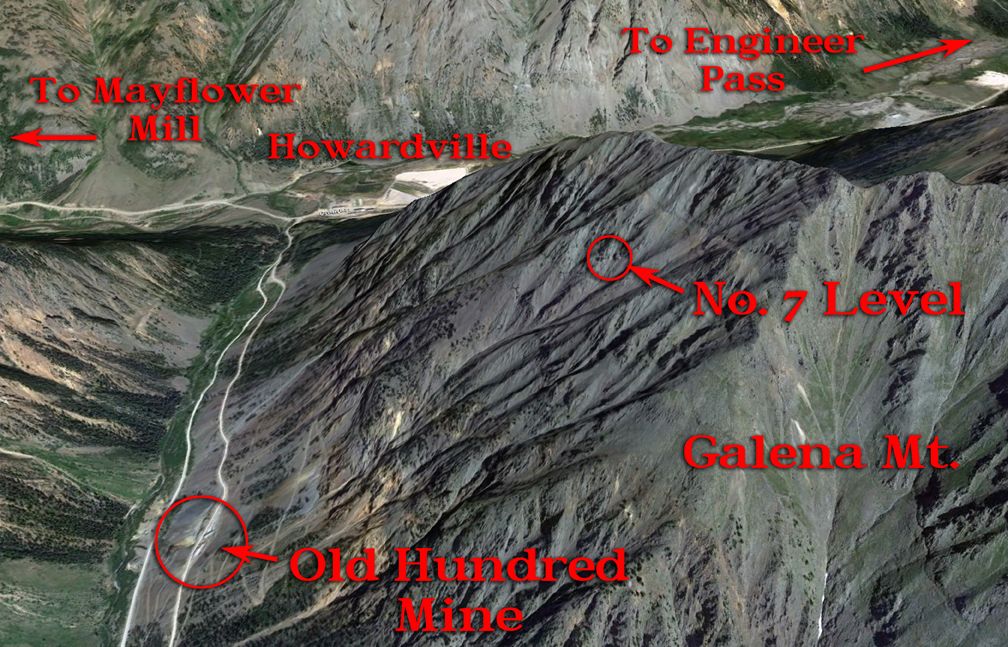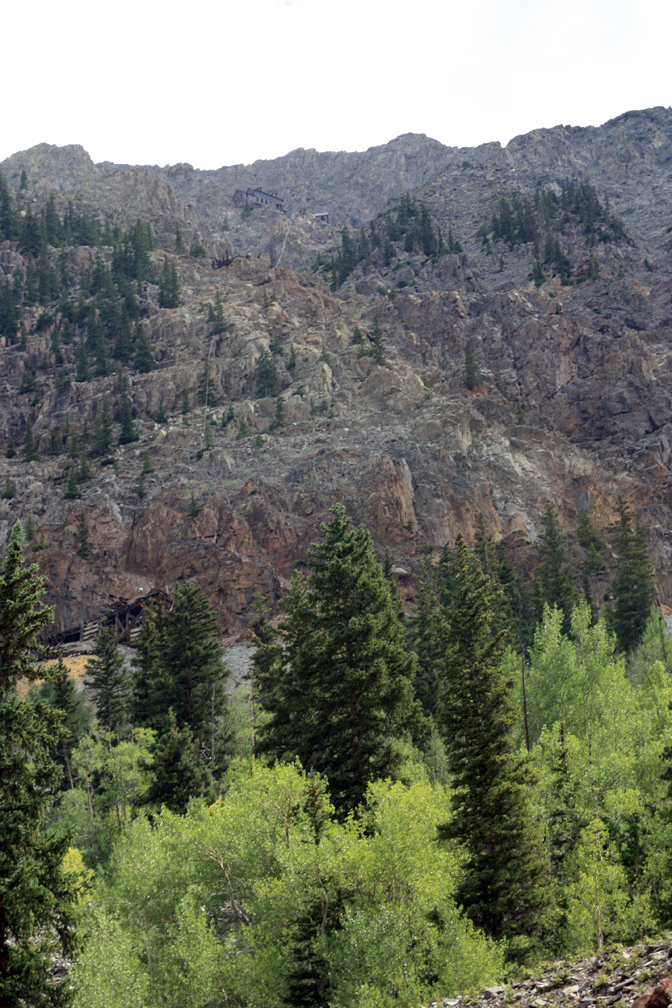The aerial tramline connecting the Shenandoah-Dives Mine above Arrastra Gulch with the Mayflower Mill. The gulch is the canyon in the foreground, and the high circque is the basin around Silver Lake.