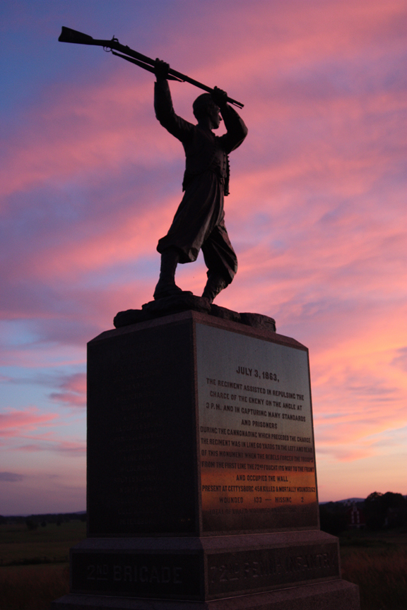 After that, I decided to visit the battlefield itself and parked at the cemetery and walked over. The sun was setting and the colors were amazing and just kept getting better – one of the best sunsets I’ve ever seen. The stone fences which the Union soldiers used for cover are still there, as is the Angle where the fiercest fighting occurred, with cannons lined up according to where they were during the battle. Each regiment from each state has a marker or statue there, ranging from simple plaques to the ornate Pennsylvania memorial.