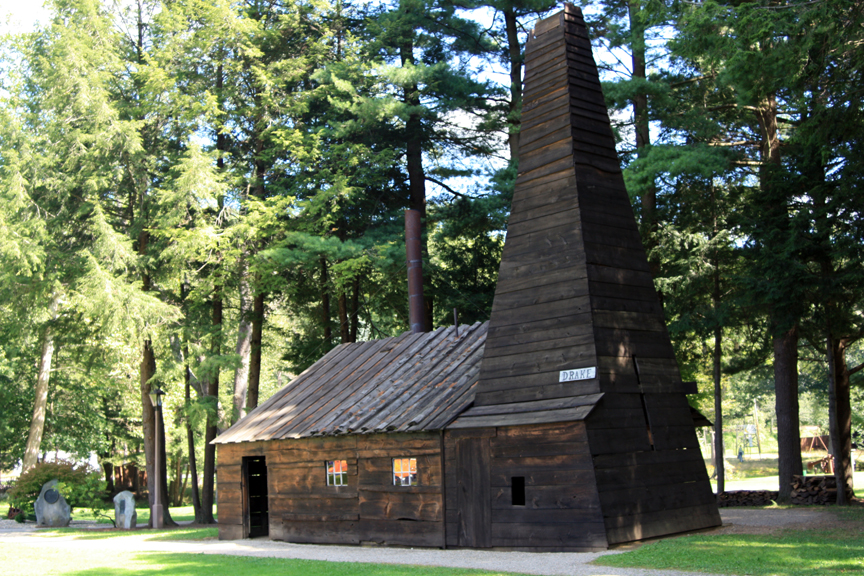 After checking out the Knob, I drove up PA 36 past I-80 and on to Sigel, PA where I turned off for Clear Creek State Park to camp for the night. The next morning was quite chilly and mist was curling up off of the river. I drove north on PA 36 to Titusville, arriving about 10:00 and visited the Drake Oil Well site. This was the first commercially successful oil well, drilled in 1859. Last week was the 150th anniversary. Edwin Drake had been sent to see if the puddles of oil that collected on the local stream (Oil Creek) could be made into a commercial venture, since kerosene was just becoming popular (it was a lot more efficient and cheaper than whale oil, which had been used up to this time for lamps). Skimming oil off the surface of the ponds was too slow, so Drake decided to drill. Using a steam engine for power, he constructed a drilling derrick that allowed the rotary motion of the engine to be translated into up and down motion using a rocking arm. A cable with a chisel at the end was suspended from the arm and it was used to punch a hole down into the rock. They soon hit an aquifer and Drake came up with the idea of encasing the hole with pipe to prevent the water from seeping in until they hit bedrock. After weeks of effort, and just as his financial backers were about to pull out, he struck oil at 69 1/2 feet. He was lucky – the oil-bearing sand bar he struck only existed in that one small area. The other oil deposits were much deeper.