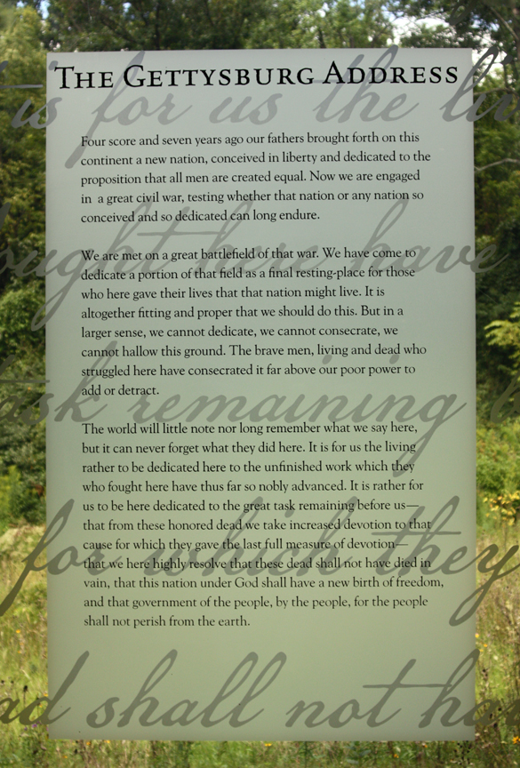 Since I got there so late, I decided to camp at Gettysburg instead of traveling on to where I had planned. The next day (Aug. 31, Monday) I traveled back to the battlefield and drove around the outer loop road, hiked to the top of Big Round Top, and visited Little Round Top as well, then saw the museum portion of the visitor’s center. I especially like this window with the Gettysburg Address framed by trees from outside.