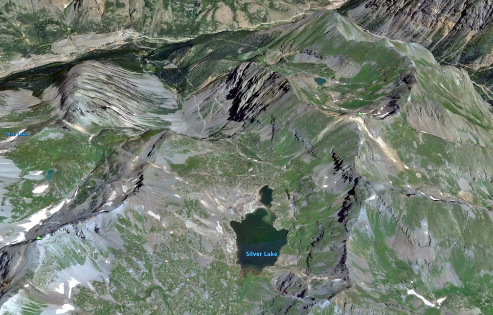 Google Earth view of Arrastra Gulch and Silver Lake. The Mayflower Mill is located at the bottom of the gulch in the upper left corner.