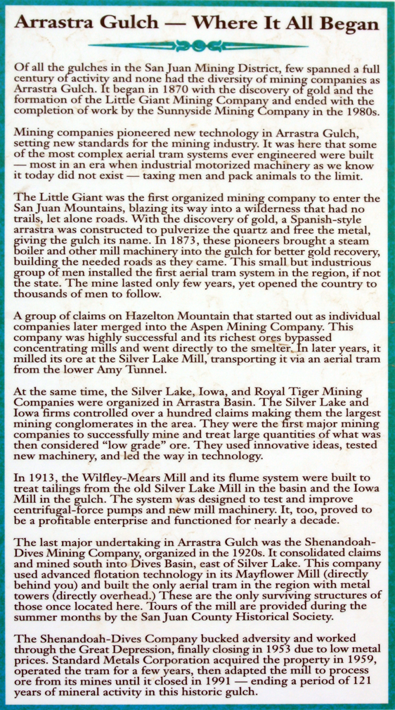 I stopped along the way toward Silverton at the base of Arrastra Gulch. This is the location of the main mining area around Silverton and one of the richest deposits in all of the San Juan Mountains. Before a proper mill could be built to process the ores, a Spanish-style arrastra was built here, which is a circular area with a flat stone floor and a central post with arms coming out. Each arm had a heavy stone or iron weight that hung from it and which would drag over the ore and crush it. Mules, donkeys, or even humans would be used to push the arms around in a circle. Once mills were built, the ore was transported to them from Arrastra Gulch and the high glacial circque above it (around Silver Lake) by tramlines or flumes. At one point as many as four separate overlapping trams were operating.