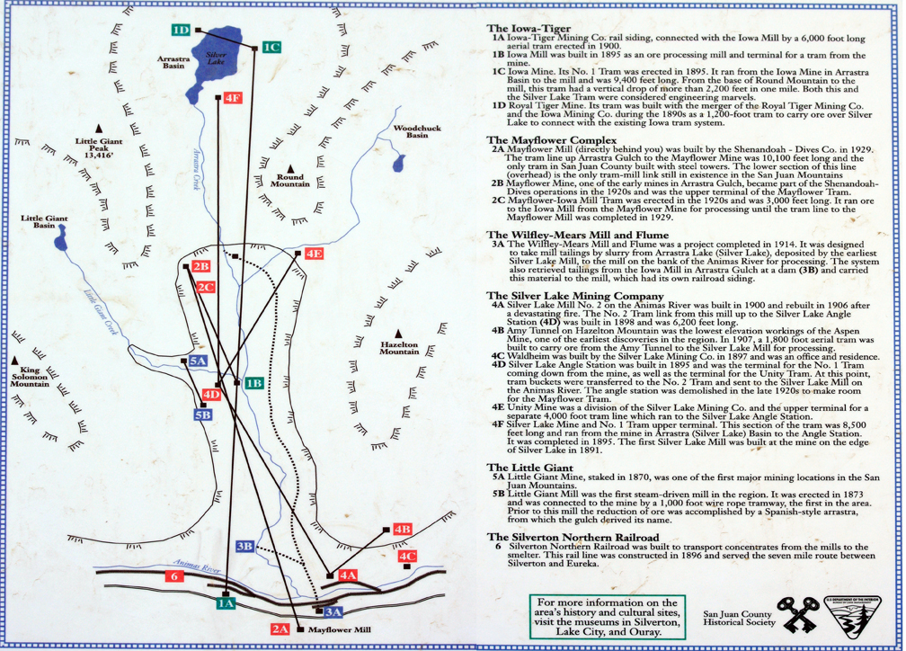 The largest mill in the area was the Mayflower Mill (also known as the Shenandoah-Dives Mill) about two miles northeast of town. It was built in 1929 to process gold, silver, zinc, lead, and copper ores. Another large mill nearby was the Silver Lake Mill on the Animas River.