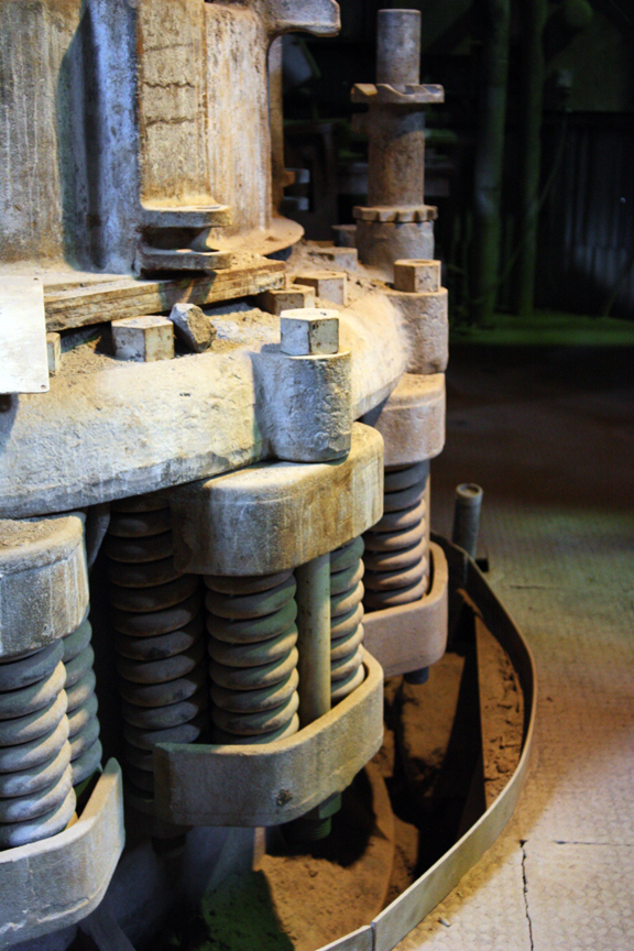 Cone crusher at the Mayflower Mill. It would crush the ore between rotating cones until it was pebble sized.