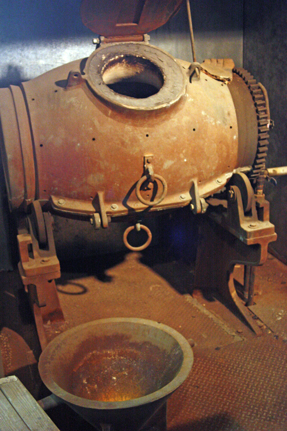 Retort furnace and gold button mold at the Mayflower Mill. The gold particles would be amalgamated with mercury, then heated in this retort furnace to drive the mercury off.