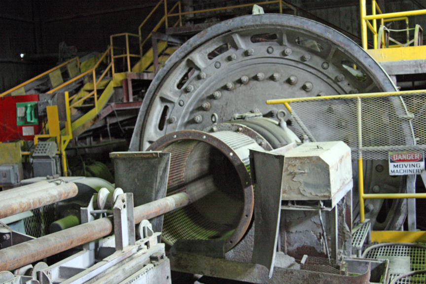 Ball mill at the Mayflower Mill. Ore crushed to the size of sand grains would enter the rotating drum and be crushed to powder by 2-3 inch iron balls.
