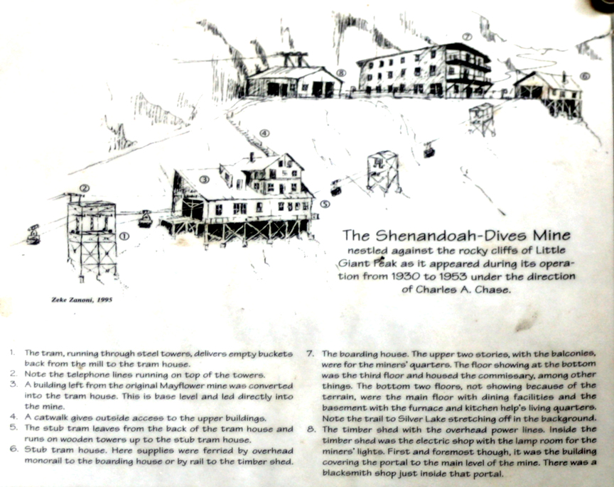 A sketch showing what the Shenandoah-Dives mine looked like during the 1930s. The aerial tramline connected with the Mayflower Mill.