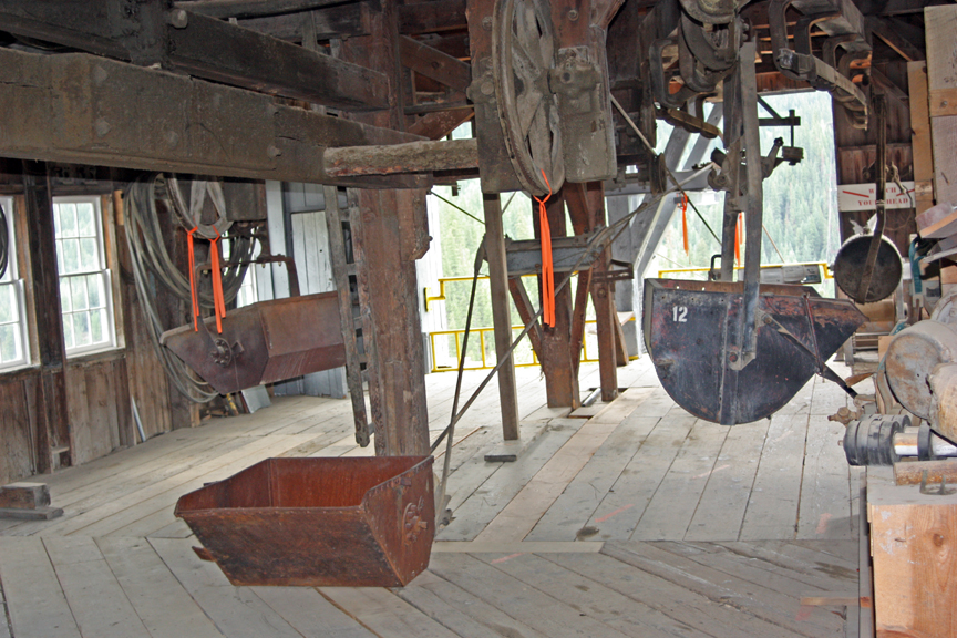 Built of pre-framed Oregon fir and completed in six months for $373,000, the Mayflower Mill began processing ore in Feb., 1930 and continued in operation for 49 of the next 61 years, finally closing down in 1991. It is in fact still capable of operation, and all the original equipment is intact. The historical society allows self-guided tours that start in the machine shop, then move to the tram station, ore storage bins, ball mills, flotation cells, recovery system, assay office, etc.